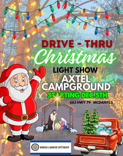 Friday, Dec 5 through Sat, Jan 3-(every Fri-Sun) from 5-11pm CST-Drive Thru Christmas Light Show at Axtel Campground, sponsored by Breck League Optimist